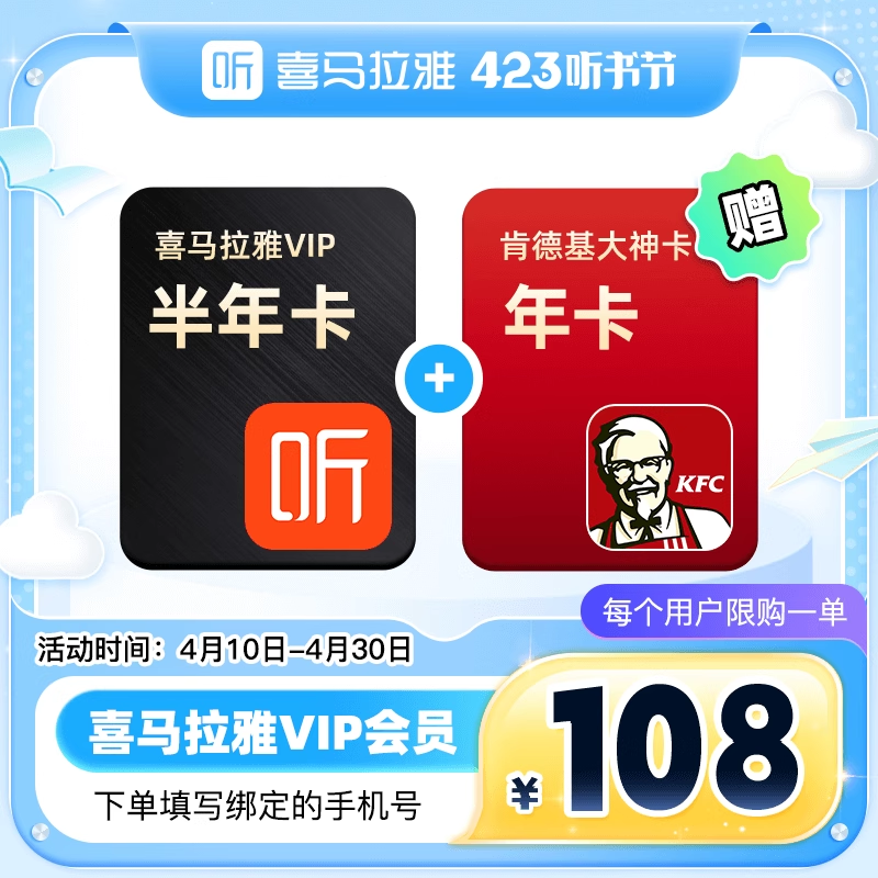 【限时活动】喜马拉雅联名VIP会员『喜马VIP半年+肯德基年卡』