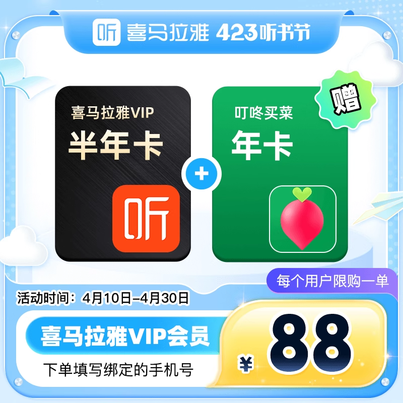 【限时活动】喜马拉雅联名VIP会员『喜马VIP半年+叮咚买菜年卡』